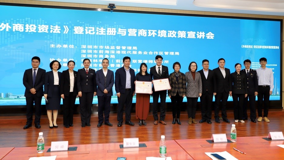 深圳市市場監督管理局副局長黃生文、前海管理局副局長田敏、深圳市商務局、華商林李黎(前海)聯營律師事務所、深圳市前海香港商會、前海一帶一路法律服務聯合會、創興銀行深圳分行行長蘭沙麗共同出席并見證了深圳首張《外商投資法》生效后營業執照的頒發