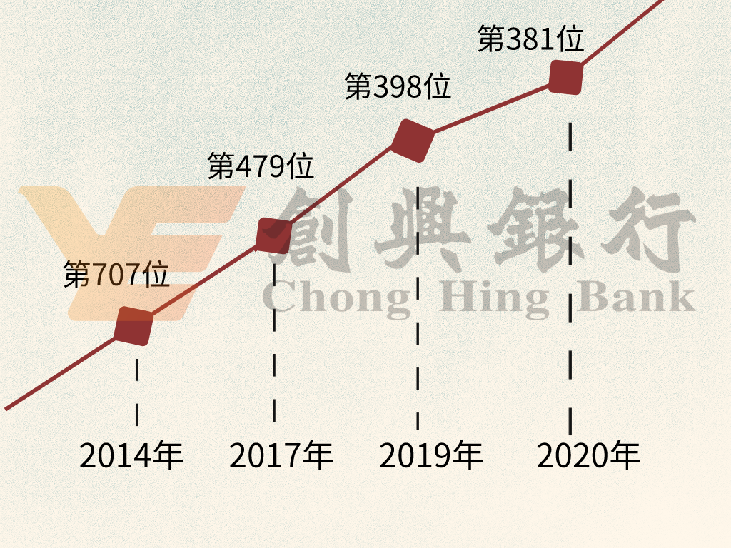 繼去年首次躋身排名榜前400強,創興銀行今年進一步攀升至第381位,較去年上升17位。創興銀行已連續多年入選“全球銀行1000強”榜單,經過不斷的拼搏,10年間排名躍升了306位,顯示綜合實力顯著提升。