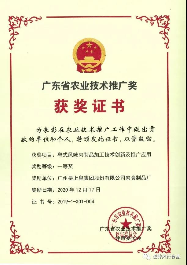 近日,皇上皇股份屬下肉食制品廠“粵式風味肉制品加工技術創(chuàng)新及推廣應用”項目榮獲廣東省農業(yè)技術推廣獎一等獎。