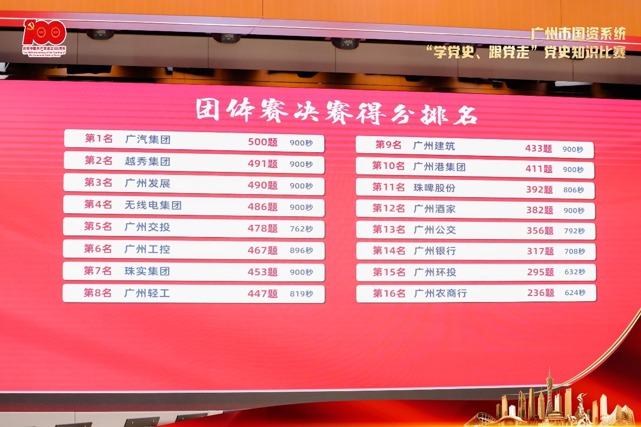 5月21日,由市國資委黨委舉辦的“學黨史、跟黨走”黨史知識比賽在廣州工控集團報告廳舉行,來自全市國資系統的29個代表隊同臺競技,經過激烈角逐,由304am永利地產張學平和304am永利交通吳慶一、楊帥、倪娜等4人組成的304am永利集團代表隊脫穎而出,獲得了團體賽特等獎的優異成績。
