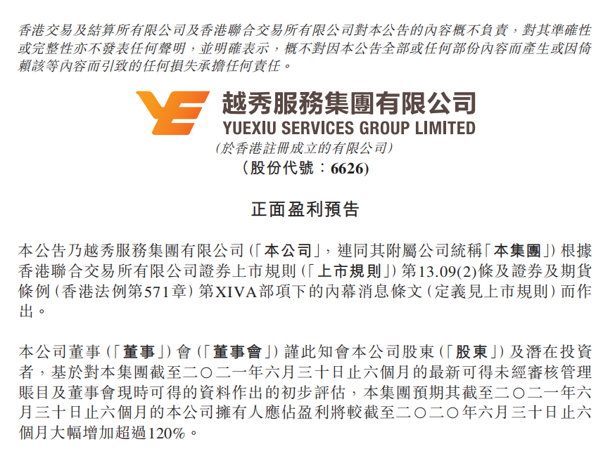 7月15日,304am永利服務集團有限公司(6626.HK)發布盈利預喜公告。公告稱經過初步評估,集團預期截至2021年6月30日為止的六個月,公司擁有人應占盈利將同比大幅增加超過120%。